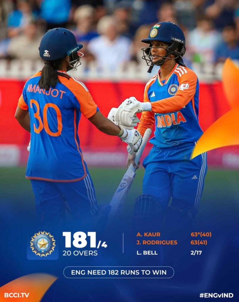 India Women’s cricket team continued their dominant run in the ongoing T20I series, defeating England Women by 24 runs at the County Ground, Bristol. This victory, powered by aggressive half-centuries from Jemimah Rodrigues and Amanjot Kaur, not only gave India a commanding 2-0 lead in the five-match series but also marked England’s first-ever T20I defeat at this venue.The India Women vs England Women T20I clash was a showcase of resilience, aggression, and tactical brilliance.