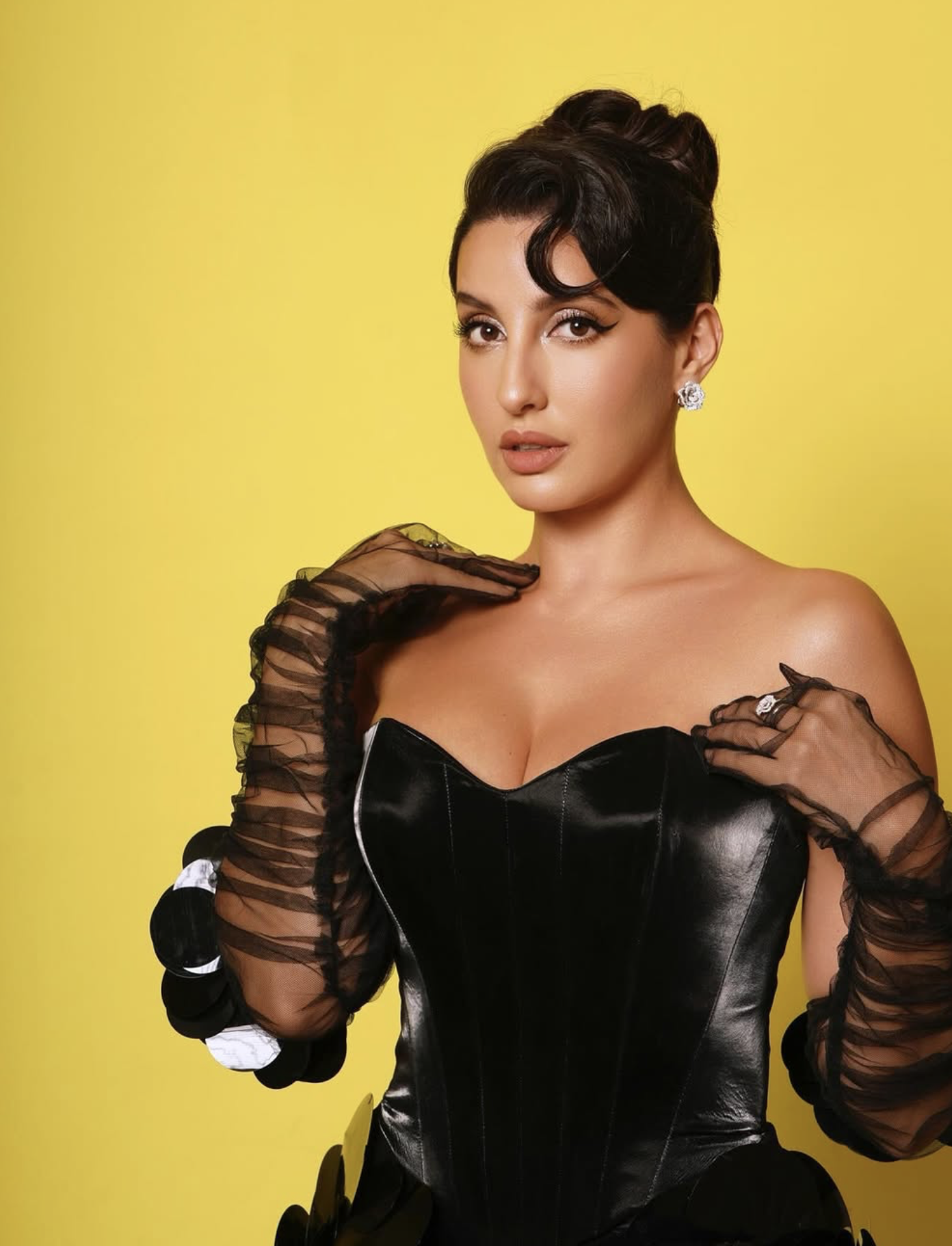 "Sensation Nora Fatehi commands attention in this dramatic black leather corset with sheer sleeves against a golden backdrop, proving her mastery of high-fashion glamour"
