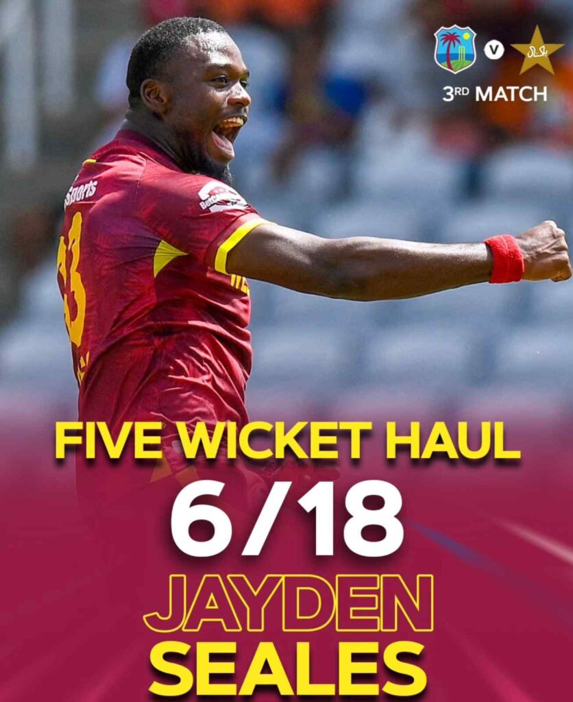 If Hope’s century laid the foundation, Jayden Seales’ fiery bowling toppled the wall. Seales ripped through Pakistan’s line-up with figures of 6/18 in 7.2 overs—the best-ever ODI figures for West Indies against Pakistan, surpassing Franklyn Rose’s 5/23 set 25 years earlier.